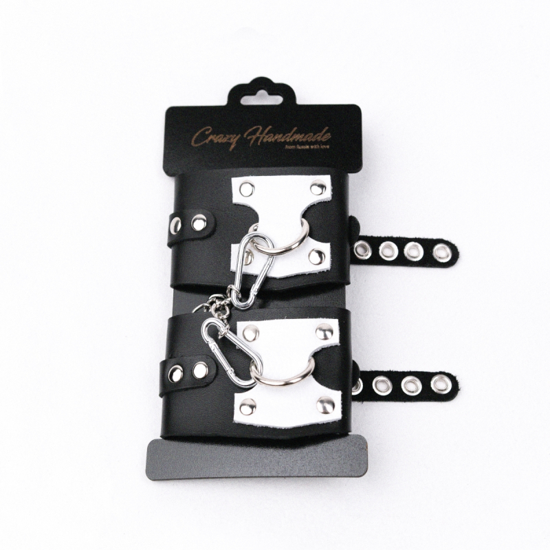 Выполнены оковы из натуральной кожи в черном цвете и декорированы белой кожаной вставкой и металлическими клепками